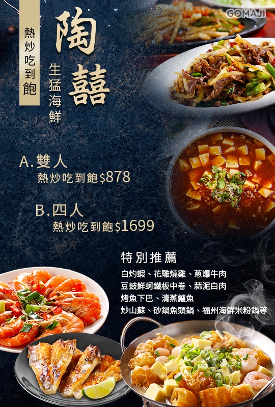 熱炒吃到飽!【陶囍生猛海鮮】現點現炒的台式佳餚,這裡一次都可以吃到!嚴選新鮮食材,經主廚快手熱炒各式佳餚,讓麻吉們一飽口福~